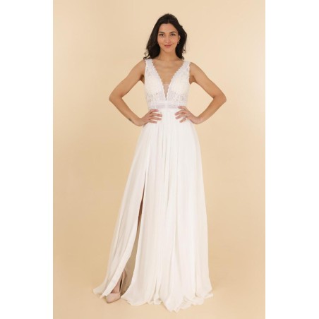 Superbe robe de mariée toute en mousseline de style champêtre, robe avec col en V devant, bustier toute en dentelle avec 2 bretelles en dentelle, fermeture dos avec boutons derrière le cou.