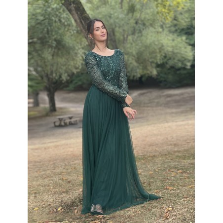 Robe toute en tulle avec le haut entièrement couvert de perles brillantes, avec manches longues brillantes. Robe avec léger volume.
