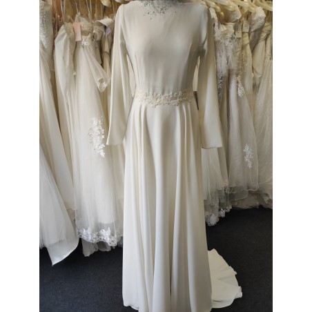 Superbe robe de mariée toute en crêpe, entièrement fermée devant (sans coques à l'intérieur).