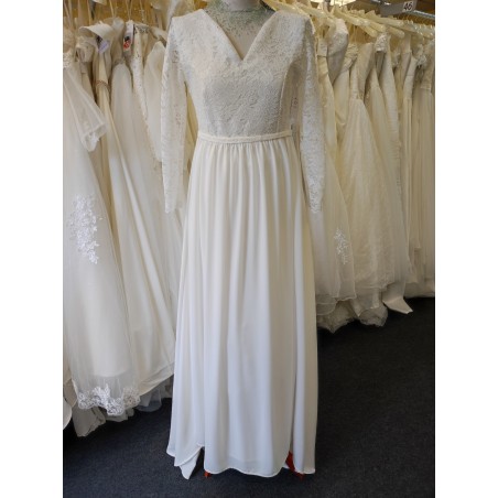 Robe de mariée toute en crêpe avec haut col en V tout en dentelle devant et dans dos, avec manches longues transparentes en dentelle.