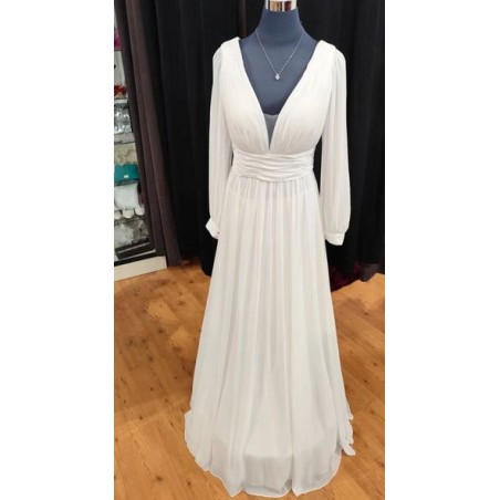 Robe toute en mousseline, avec bustier drapé et effet ceinture large à la taille, avec manches longues légèrement transparentes et fluides + aux poignets 2 boutons brillants.