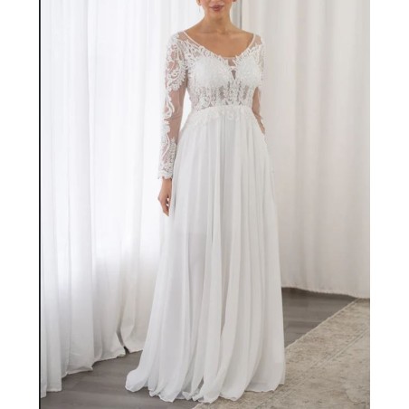 Robe en mousseline avec bustier effet transparent couvert de dentelles et perles brillantes, robe avec manches longues en tulle recouvertes de dentelle avec perles brillantes.