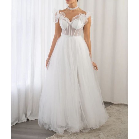 Robe de mariée toute en tulle avec bustier de forme coeur, avec effet corset transparent.