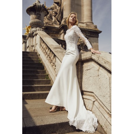Robe de mariée toute en crêpe de forme sirène, avec bustier effet transparent entièrement fermé couvert de dentelles et perles brillantes.