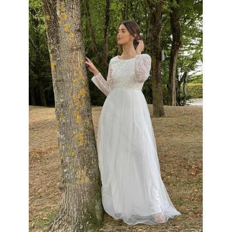 Le haut de la robe est entièrement couvert de pampilles brillantes avec des manches longues brillantes.