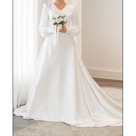 Robe de mariée toute en satin ivoire avec col en V avec manches longues "effet épaulette"