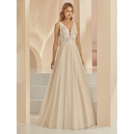 Le haut de la robe est en dentelle fine de couleur ivoire, robe avec 2 bretelles, col V devant et dans le dos.
