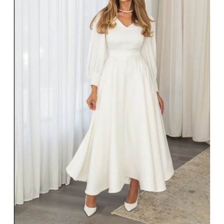 Robe mi-longue entièrement en crêpe, avec col en V et manches longues bouffantes, accompagnées de boutons aux poignets.