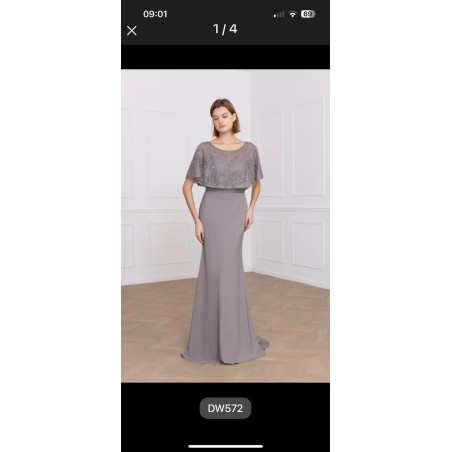 Robe longue en crèpe avec avec bustier couvert d'un haut "effet cape avec manches courtes", cette "cape est en dentelle transparente avec perles brillantes cousues dessus.