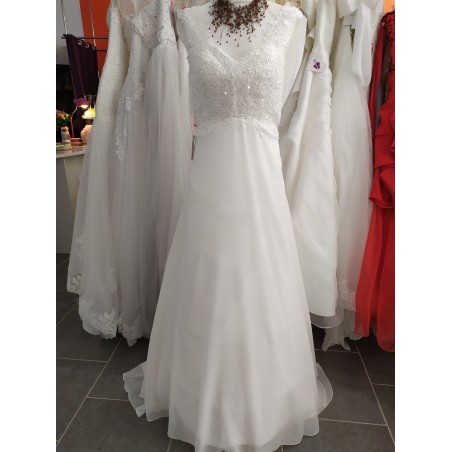 Superbe robe de mariée en mousseline avec bustier forme coeur recouvert de broderie en forme de fleurs, avec quelques sequins brillants, avec petites manches transparentes en dentelle.