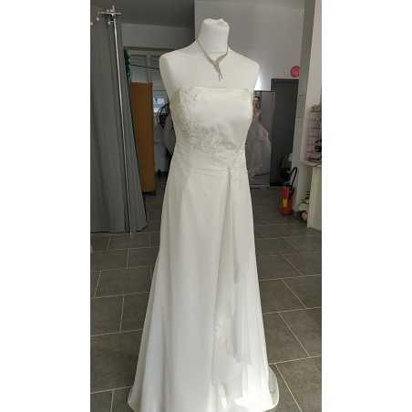 Superbe robe de mariée en mousseline avec bustier droit en satin avec quelques perles et sequins brillants, avec drapé sur le coté.